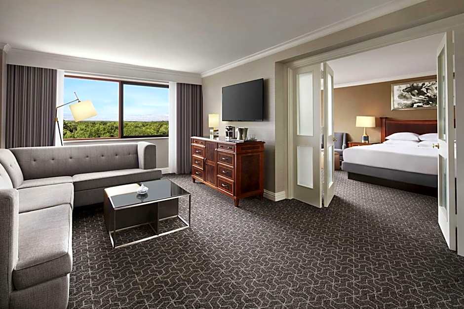 This spacious suite offers plush bedding and a living room with a sofa bed.